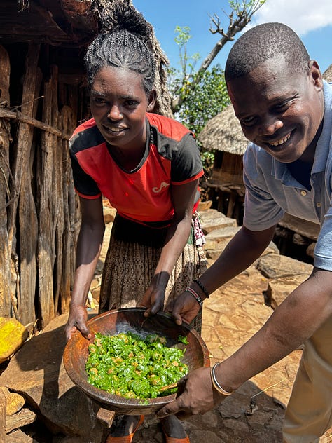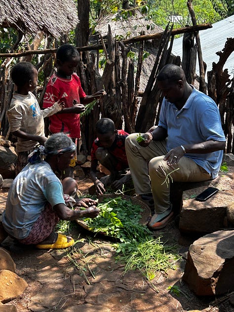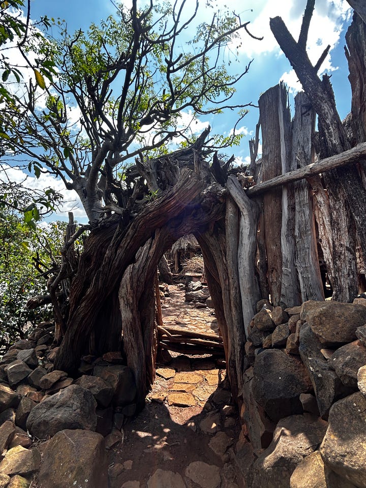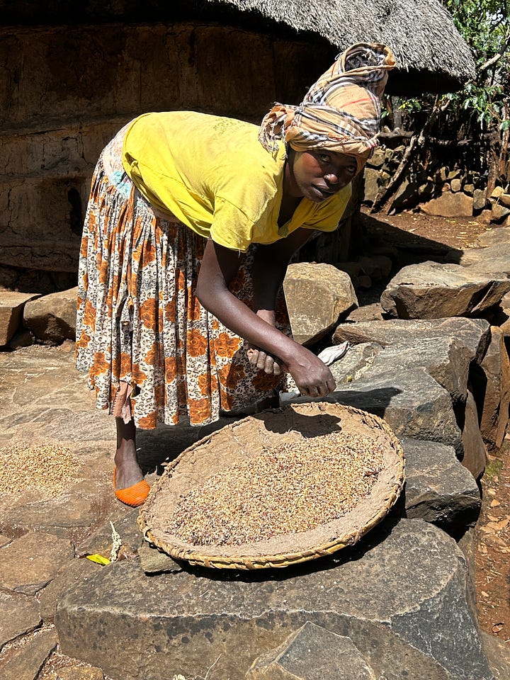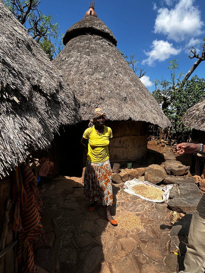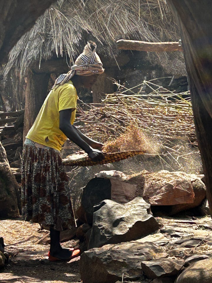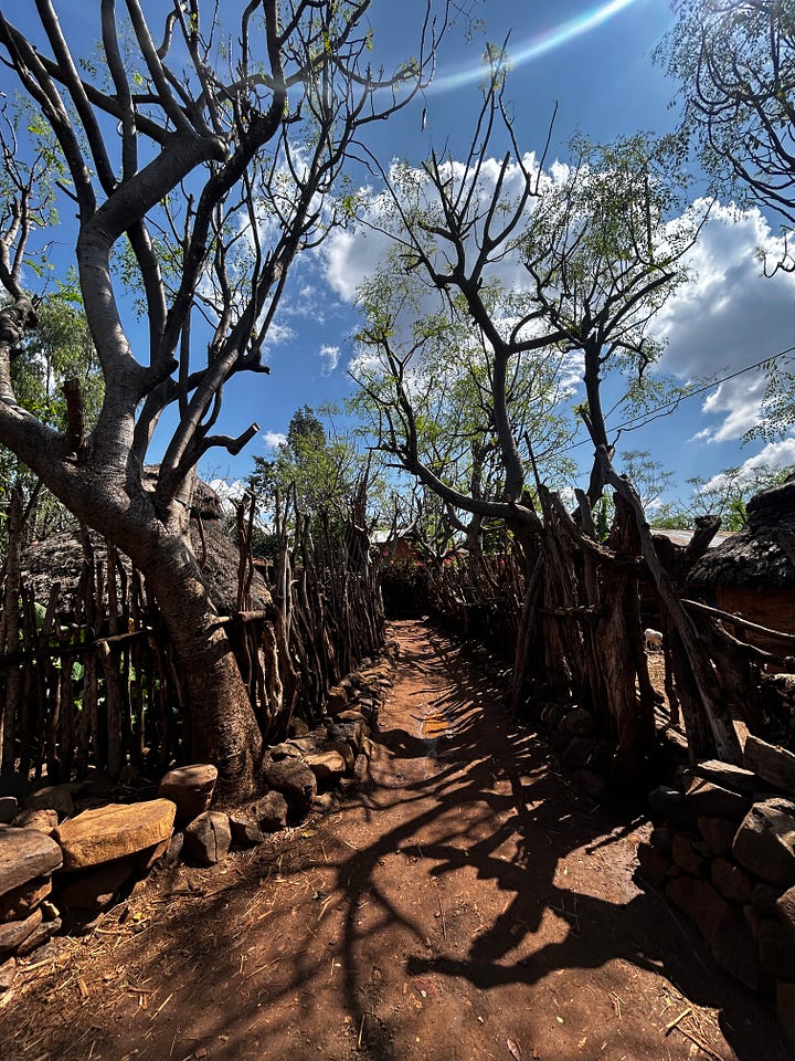 We walked around the village, taking in its beauty, the paths winding this way and then that—the thatched roofs glistening in the sun, the paths mottled with sunshine. We arrived at a home and went inside to see it. The compounds are divided into two sections: one for animals, usually the lower one, and the rest for the family. There were 3-4 huts, one bedroom, one kitchen, and a third for storage and a partial kitchen. Grains were drying for storage, coffee leaves for “cola”, and animal feed on hand. We chatted with the owner about her hardships and life. It is a very basic sustenance, the food coming from the farms, the animals producing milk and eggs. The plot had a morninga tree whose leaves were eaten daily. We discussed coming back the next day for a meal and left.