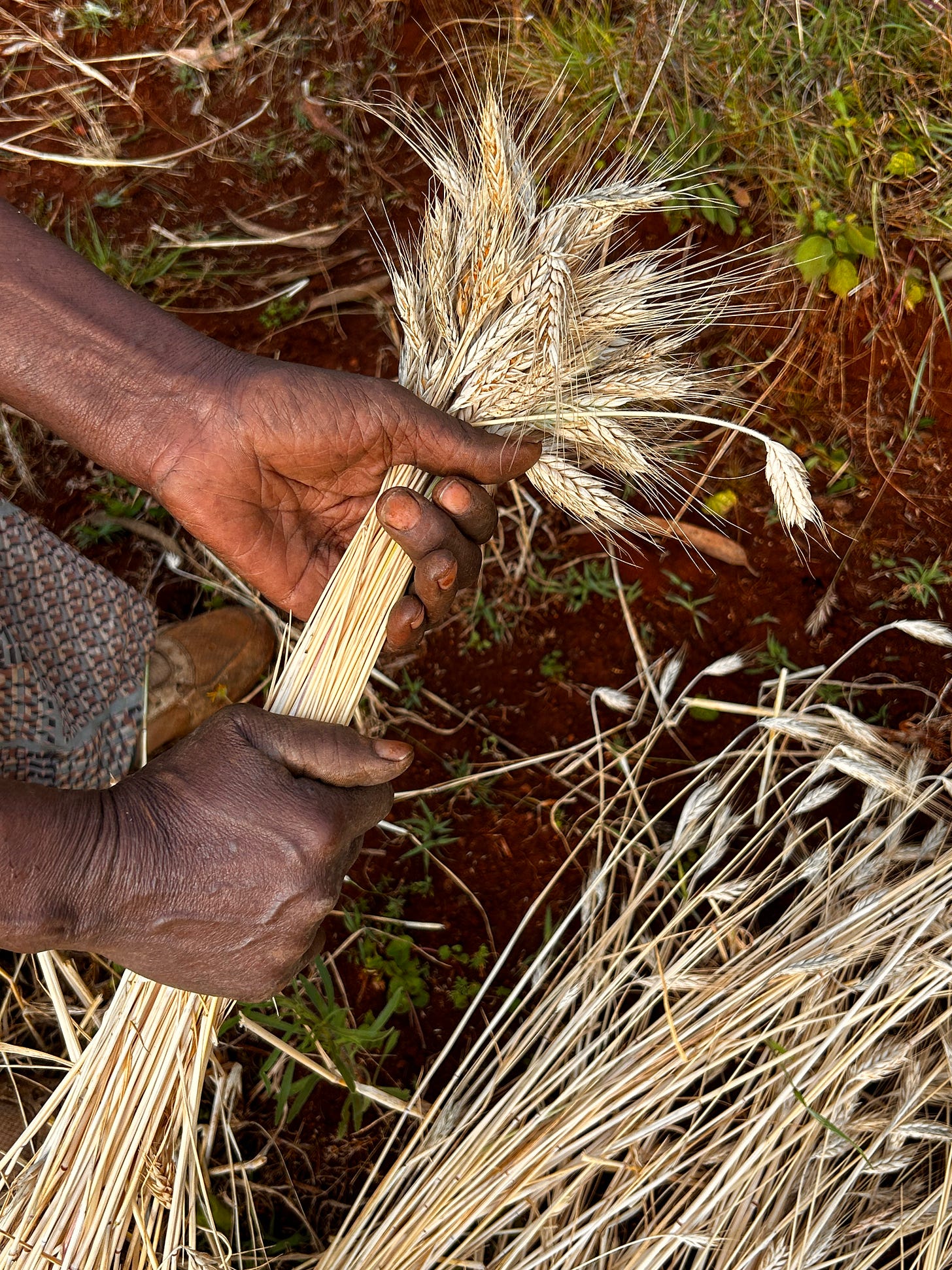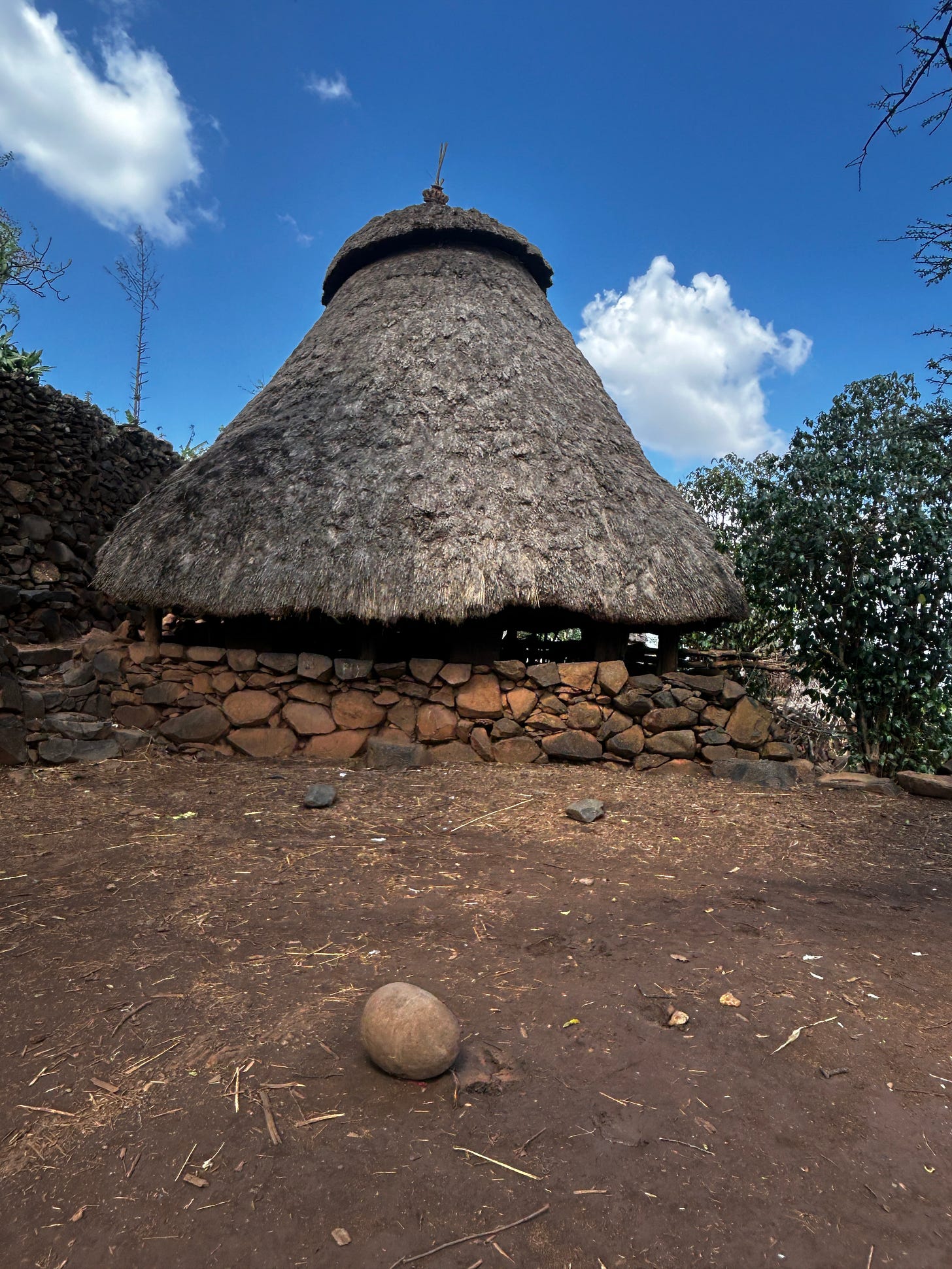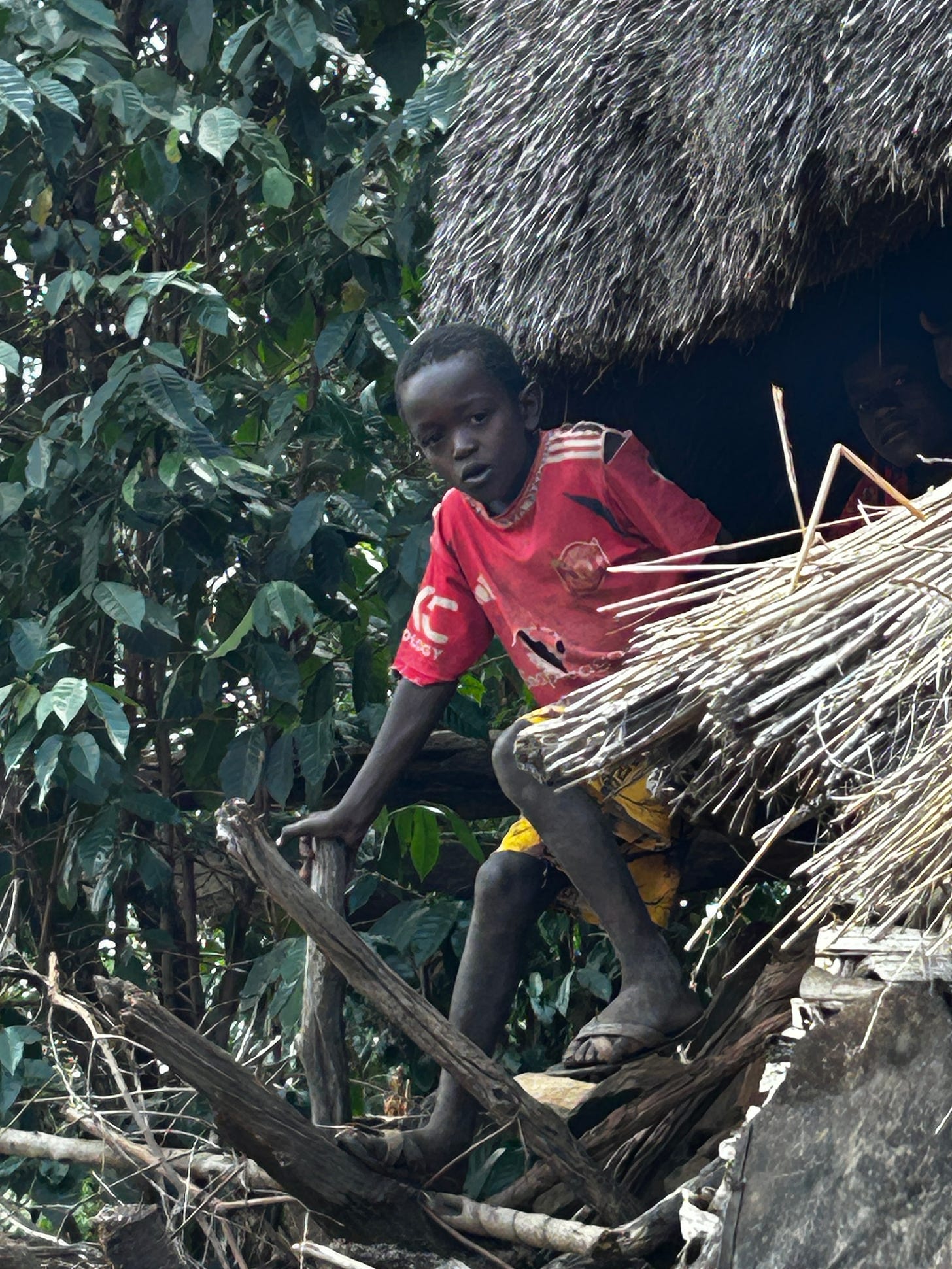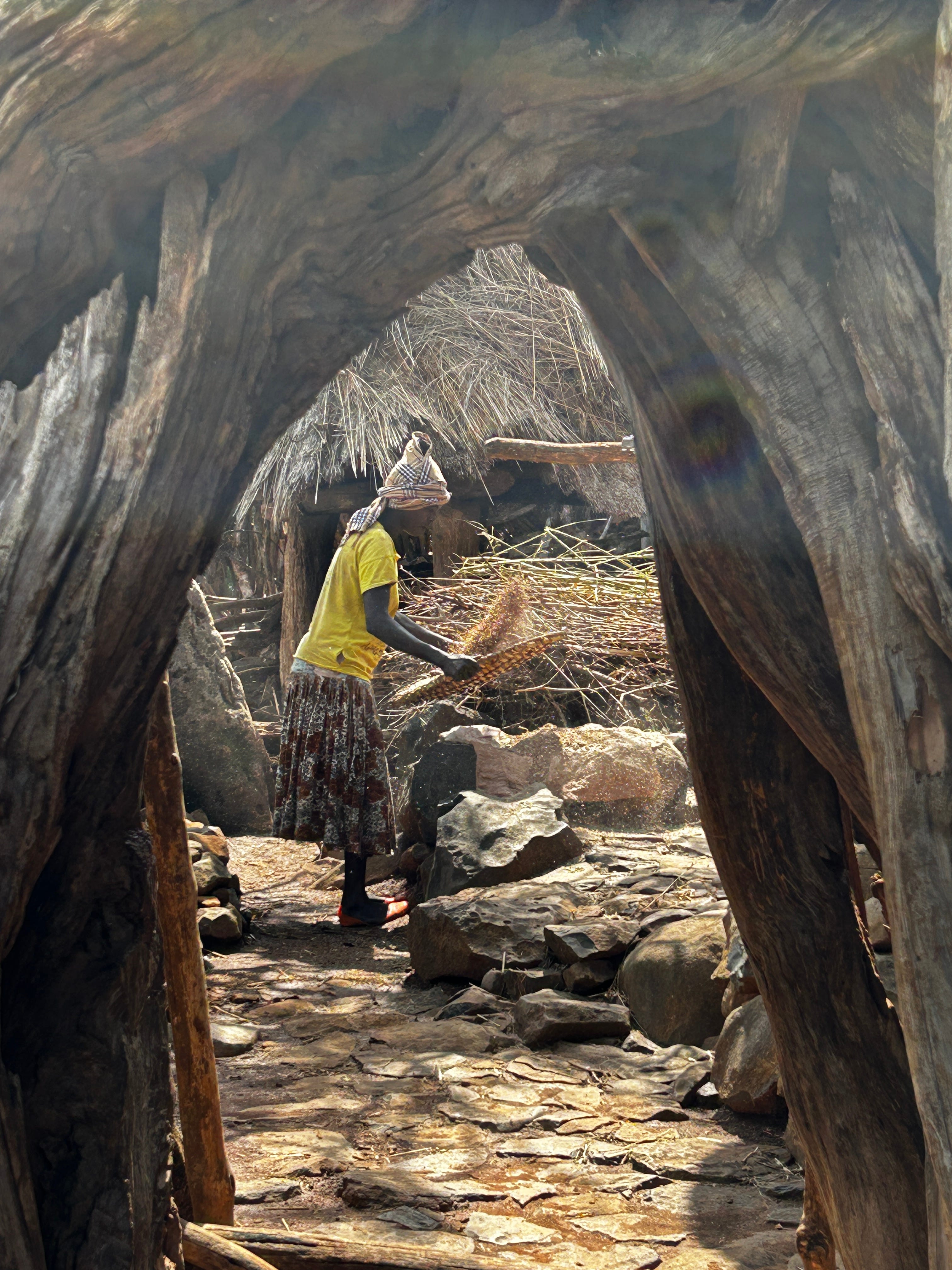 We walked around the village, taking in its beauty, the paths winding this way and then that—the thatched roofs glistening in the sun, the paths mottled with sunshine. We arrived at a home and went inside to see it. The compounds are divided into two sections: one for animals, usually the lower one, and the rest for the family. There were 3-4 huts, one bedroom, one kitchen, and a third for storage and a partial kitchen. Grains were drying for storage, coffee leaves for “cola”, and animal feed on hand. We chatted with the owner about her hardships and life. It is a very basic sustenance, the food coming from the farms, the animals producing milk and eggs. The plot had a morninga tree whose leaves were eaten daily. We discussed coming back the next day for a meal and left.