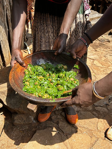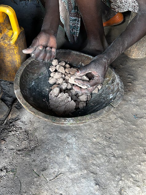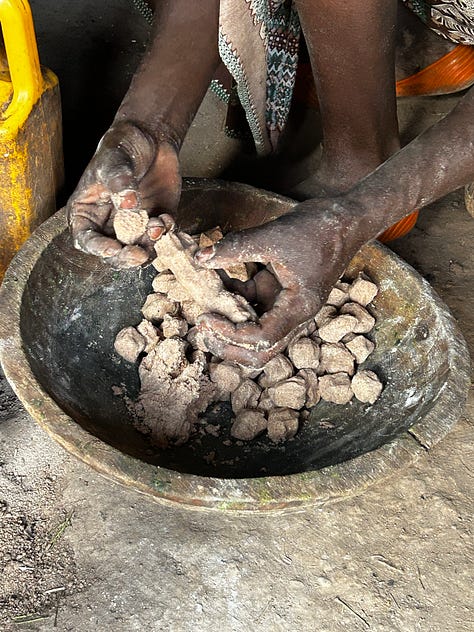 The dish, kurkufa, was served in communal bowls, and we tasted tentatively at first and then greedily, it was delicious. The morninga is herby, the sorghum dumplings chewy and filling. This is a standard dish at her home often, easy to make, and made from the meagre produce of the land on hand.
