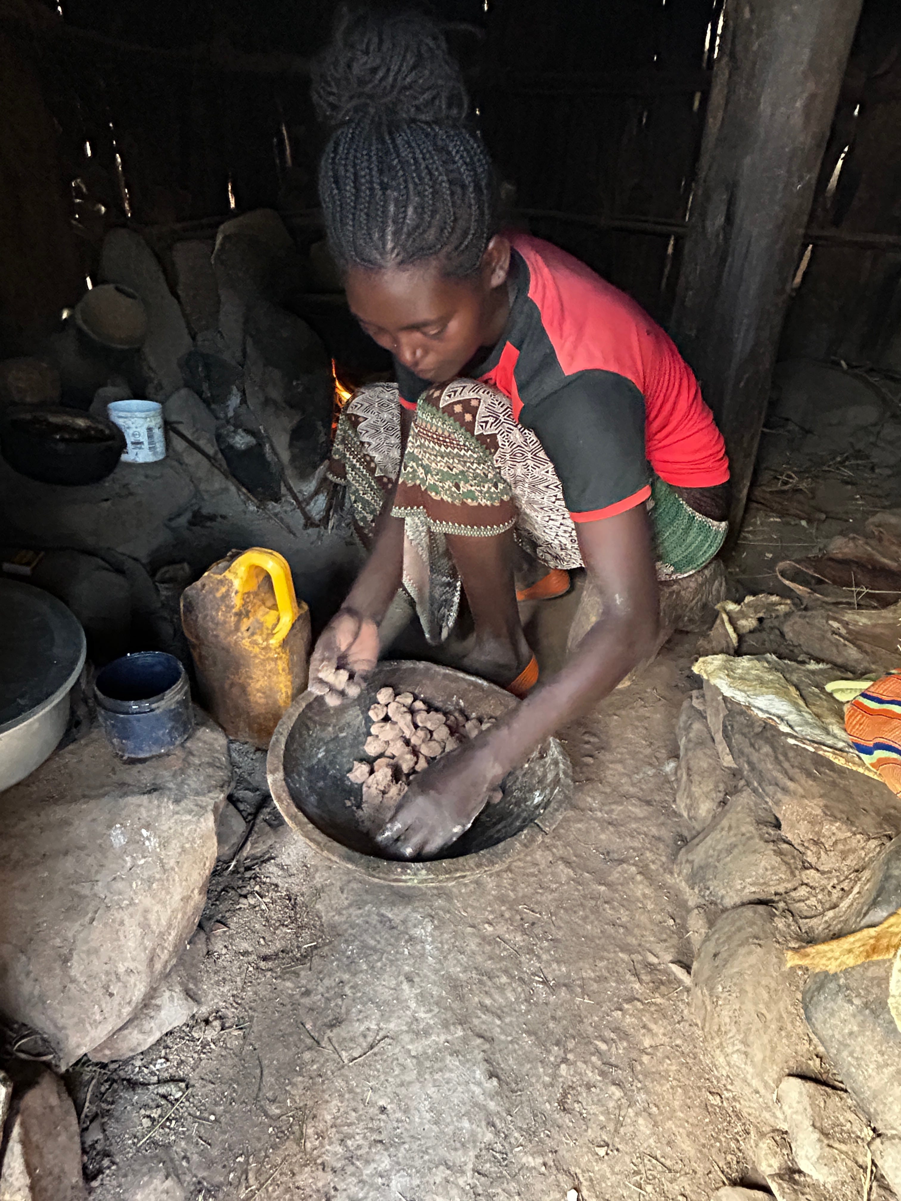 We finished with cups of “cola” a strong brew made from the dried coffee leaves, spices and chillies. Thick, herby and spicy, it was the perfect way to end this hearty meal. I had purchased some mangoes from the Omo Valley as a gift, and I handed them over as a token of my gratitude. Our host smiled gratefully; she was glad to have shared this afternoon with use, showing us a brief window to life in a Konso community. Her grace will stay with me, the chicken that was there for eggs, and who tried to peck at the food, the goats that were happy with the stripped stems of morninga, the kids that came by to watch us and ended up with a plate of food.