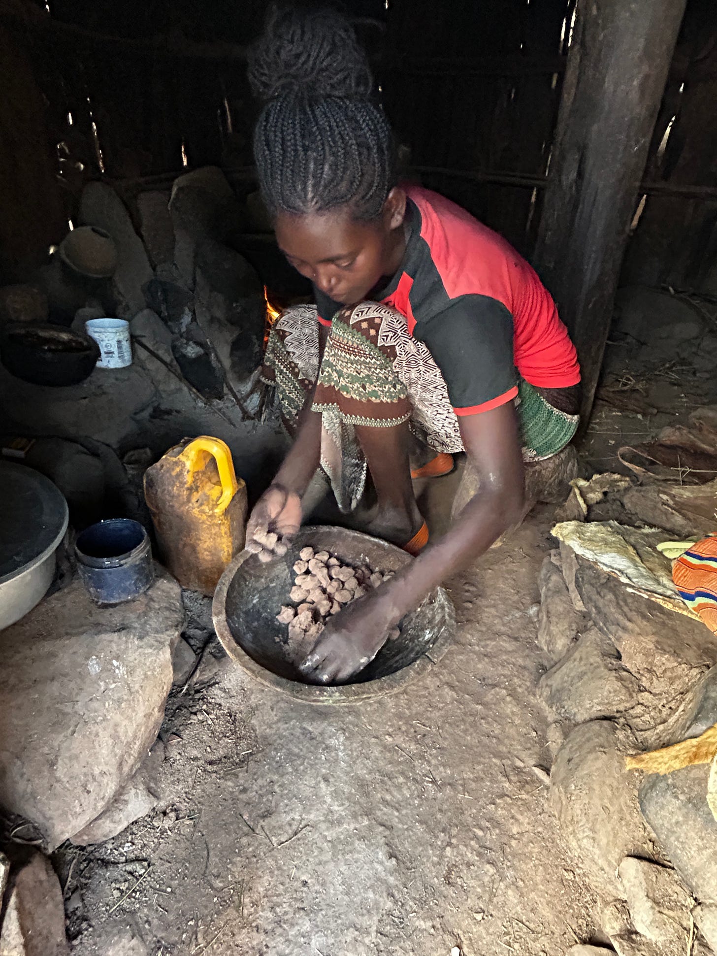 The next day we returned for lunch. The lady cooked it quickly, stripping a huge mass of morning leaves from their stems. She proceeded to make dumplings out of sorghum, small balls that were made deftly, with years of practice. She boiled the dumplings, and at the end threw in the morning leaves for a dry stew. Meanwhile, the neighbouring kids had accumulated, ogling at me, trying to figure out what I was doing.